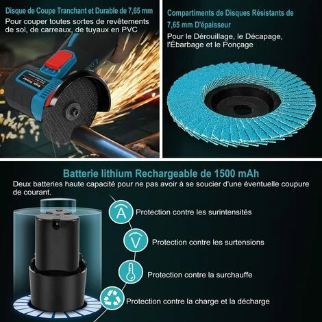 ��Extra langlebiger 1500-mAh-Akku*2�� Dieser 12,6-V-Akku-Winkelschleifer wird mit zwei wiederaufladbaren 1500-mAh-Akkus geliefert. Durch die zwei leistungsstarken Akkus mit langer Lebensdauer k?nnen Sie den Mini-Winkelschleifer lange ununterbrochen verwenden, ohne sich Sorgen machen zu m��ssen, dass der Winkelschleifer leer wird und Ihre Arbeit unterbricht.