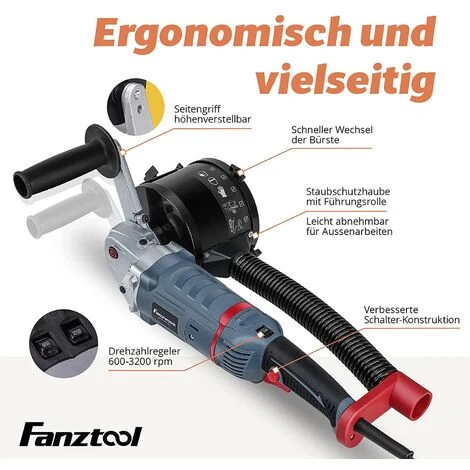 Ergonomisch einstellbarDurch die um 90° verdrehte Anordnung der Bürste und einen ergonomisch einstellbaren Seitengriff, ist die FANZTOOL Bürstenmaschine extrem handlich und anwenderfreundlich und erleichtert so Ihre Arbeit enorm.Auswechselbare BürstenköpfeDie Bürsten des Bürstenschleifers lassen sich mit einfachen Mitteln austauschen. Das Praktische daran ist, dass neben einer Imbusschraube kein zusätzliches Werkzeug benötigt wird. So können Sie den Schleifer schnell an den Untergrund anpassen.Mit StaubschutzhaubeDurch die stabile Staubschutzhaube aus Metall sind fliegende Späne beim Schleifen kein Problem mehr. Die Führungsrolle sorgt zudem bei unebenen Oberflächen für eine gleichbleibende Arbeitsposition.Neuer Schalter für mehr ArbeitssicherheitBeim Schleifen kann schnell viel Staub entstehen, der zu Störungen führen kann. Bei unserem Modell 2021 haben wir den Ein/Aus-Schalter neu abgedichtet, damit dieser nicht blockiert. So sorgen wir für noch mehr Sicherheit bei der Arbeit.