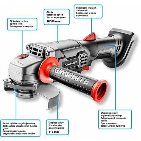 Der Trennschleifer ist kompatibel mit 18V Li-Ion Energy + Akkus. Entwickelt für Scheiben mit 115 mm Durchmesser und einer Drehzahl von 10.000 U/min. Das Gerät ist mit einem zweistufigen Schaltknopf ausgestattet, wodurch Sicherheit und perfekte Kontrolle während des Arbeitens gewährleistet werden kann. Die wohl bedachte ergonomische Bauart des Gerätes verhindert zusätzlich zu den gummiüberzogenen Griffen eine ausgezeichnete Haptik und Arbeitskomfort. Das Gerät hat eine vergleichsweise schmale Bauart, wodurch sogar Arbeiten an schwer zugänglichen Stellen ermöglicht werden. Ein integrierter Spindelarretierknopf verhindert eine versehentliche Inbetriebnahme des Schleifers und bietet somit zusätzlichen Schutz für den Nutzer. Seitlich gelegene Lüftungsschlitze ermöglichen eine Kühlung während des Betriebs und ein verstellbarer Winkelschutz schützt vor Sprühfunken und anderen Produktabfällen.