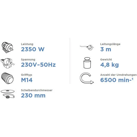 Mit leistungsstarken 2350 W leistet der Motor des professionellen Winkelschleifers hervorragende Ergebnisse beim Schneiden, Schleifen & Polieren von Werkstoffen. Die zu bearbeitenden Werkstoffe können unterschiedlichste Strukturen und Härten haben und lassen sich trotzdem durch die Schleifscheiben mit 230 mm bearbeiten. Das Gerät liegt gut in der Hand, dank der ergonomischen Bauform und dem gummierten Griff und leistet zu gutem Arbeitskomfort bei. Neben dem Hauptgriff ist auch ein gummierter Seitengriff enthalten, welcher sich an drei unterschiedlichen Punkten befestigen lässt. Dadurch ist der Schleifer für Rechts-, als auch Linkshänder geeignet. Um ein versehentliches Einschalten zu verhindern ist das Winkelschleifer mit einem zweistufigen Taster ausgestattet, der ein zufälliges Einschalten verhindert. Dank einer Taste zur Spindelarretierung, welcher zur Oberfläche des Gerätes bündig angeordnet ist, wird zusätzliche Sicherheit gewährleistet und dank Lüftungsöffnungen kann ein Überhitzen des Motors verhindert werden. Das Getriebegehäuse ist aus Aluminium gefertigt, führt Wärme gut ab und verstärkt die Konstruktion, welche mit dem leistungsstarken Motor auf bis zu 6.500 Umdrehungen pro Minute beisammen hält. Die Bürsten können von außen selbständig ausgetauscht werden. Darüber hinaus wurde der Schleifer mit einer langen flexiblen, mit robustem, gummiüberzogenen Netzkabel von einer Gesamtlänge von 3 m ausgestattet.