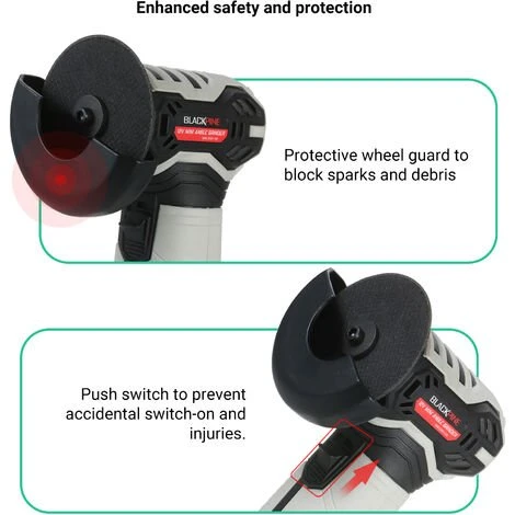 Verbesserte Sicherheit und Schutz – Dieses Gerät ist außerdem mit einem Radschutz ausgestattet, um Funken und Schmutz zu blockieren. Der Druckschalter verhindert versehentliche Starts und Verletzungen.