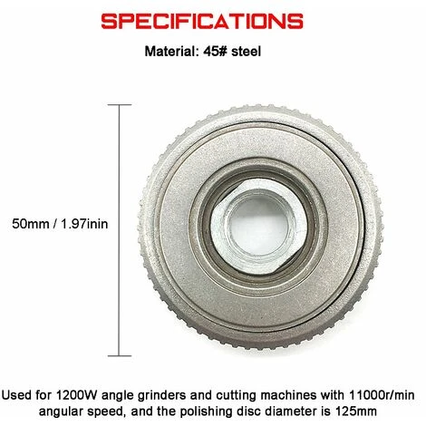 Dies ist eine Art hochwertiges Verriegelungsplattenfutter, innovatives Design, spezielle Verriegelungsstruktur, manuelles Drehen, stärkeres Befestigen der Schleifscheibe. Ausgestattet mit Slef-Locking-Funktion, spart Kraft beim Anziehen, sehr bequem. Verwendet für 1200-W-Winkelschleifer und Schneidemaschinen mit einer Winkelgeschwindigkeit von 11000 U/min und einem Durchmesser der Polierscheibe von 125 mm.
