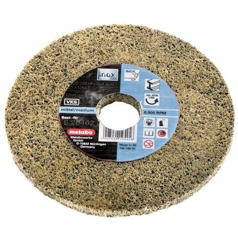 Mehrlagig verpresstes Vliesmaterial. getränkt mit in Kunstharz eingegossenem Schleifkorn (Zirkonkorund). Durch den Zusatz von Schleifkorn ist das Arbeiten vom Entgraten bis zu weichen und flexiblen Finisharbeiten möglich. Zum Entgraten. Verschleifen von Schweißnähten. präzises Reinigen und Säubern und Finishbearbeitung von Oberflächen geeignet.. Für legierte und hochlegierte Stähle. Bunt- und Leichtmetalle. Chrom- und Nickelstähle. Titan. Stähle. Profilierung des Schleifmittels möglich für präzises Arbeiten. Sehr geringe Rautiefe des bearbeiteten Materials.. Bohrung 22.23 mm (für Winkelschleifer). Max. 10.000 /min; Empfohlene Drehzahl: 3.000 /min.