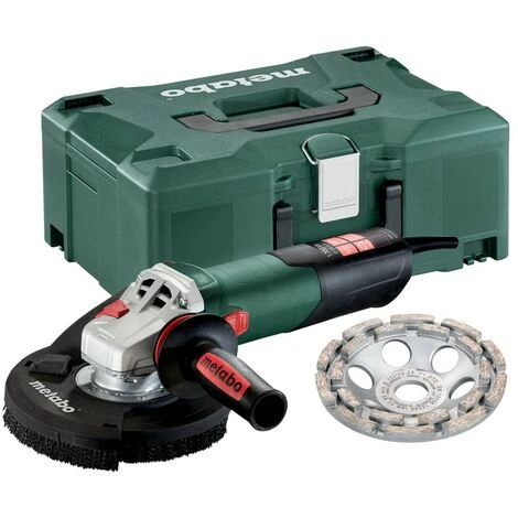 Zusatzhandgriff Metabo VibraTech (MVT), Absaughaube GED 125, Stützflansch, Zweilochmutter, Diamantschleiftopf Beton „classic“, Zweilochschlüssel, MetaLoc Koffer